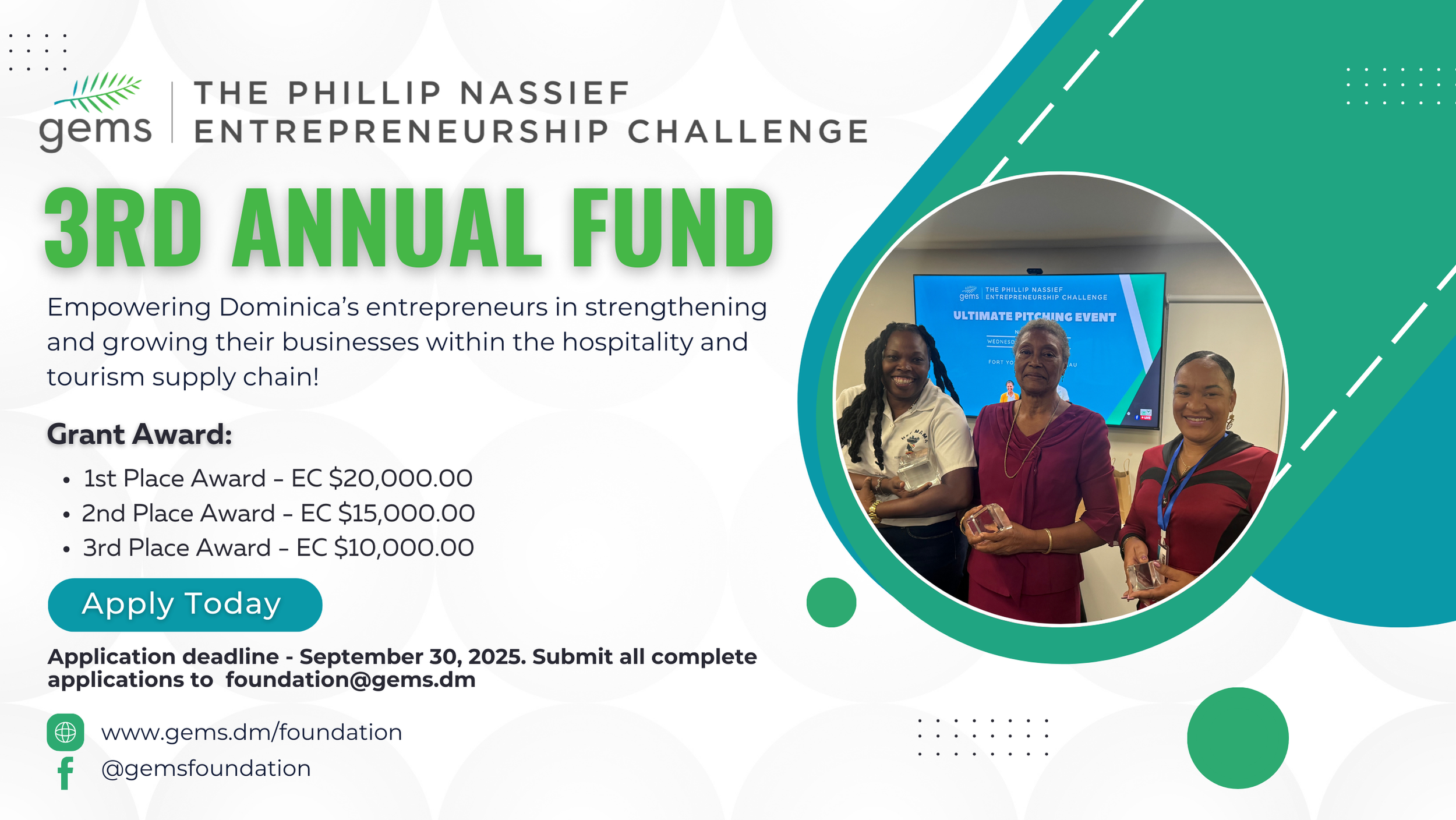 The GEMS Foundation today proudly launched the 3rd Annual Phillip Nassief Entrepreneurship Challenge, continuing its mission of empowering Dominica’s entrepreneurs to strengthen and grow their businesses within the hospitality and tourism supply chain.